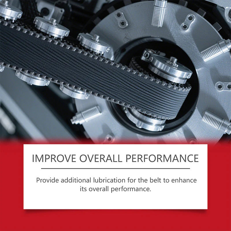 Tento sprej funguje tak, že na povrchu pryžového řemene vytváří ochrannou mazací vrstvu. Snižuje povrchové tření mezi řemenem a kladkou, čímž zabraňuje prokluzování a suchému praskání a zároveň obnovuje pružnost a přilnavost. Výsledkem je tišší motor a lepší výkon.