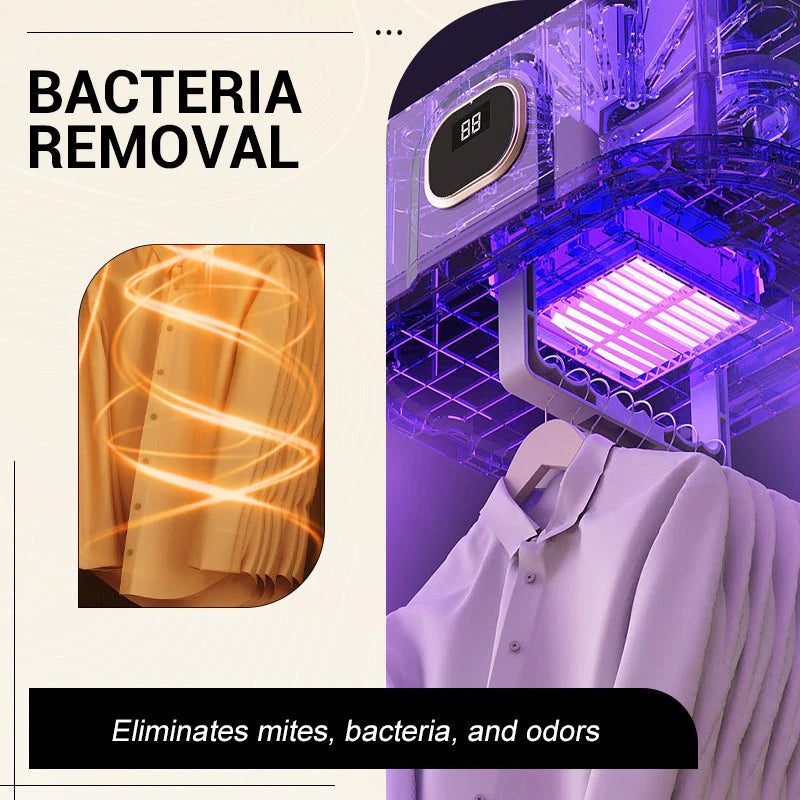 DEZINFEKČNÍ ÚČINEK – Přístroj nejen suší, ale také pomáhá udržovat čistotu. Horký vzduch ničí bakterie a roztoče, zatímco vestavěná technologie negativních iontů neutralizuje pachy. Vaše oblečení tak bude nejen suché, ale také hygienicky bezpečné a bude vonět čistě.