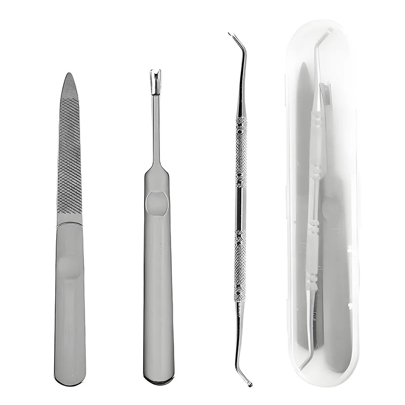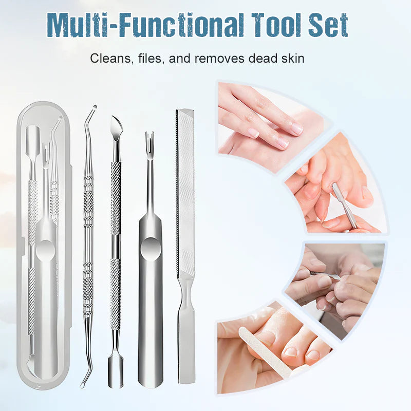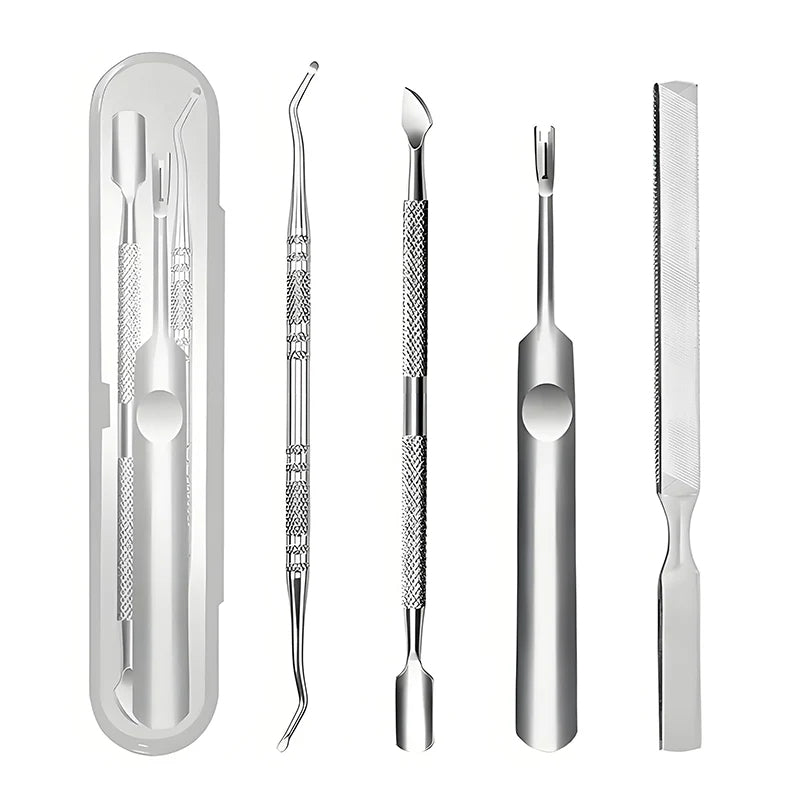 KOMPLETNÍ SADA PÉČE O NEHTY - Tato multifunkční sada obsahuje základní nástroje pro zatlačení nehtové kůžičky, odstranění odumřelé kůže a čištění pod nehty. Nabízí kompletní řešení pro udržení krásných a zdravých nehtů bez návštěvy salonu.