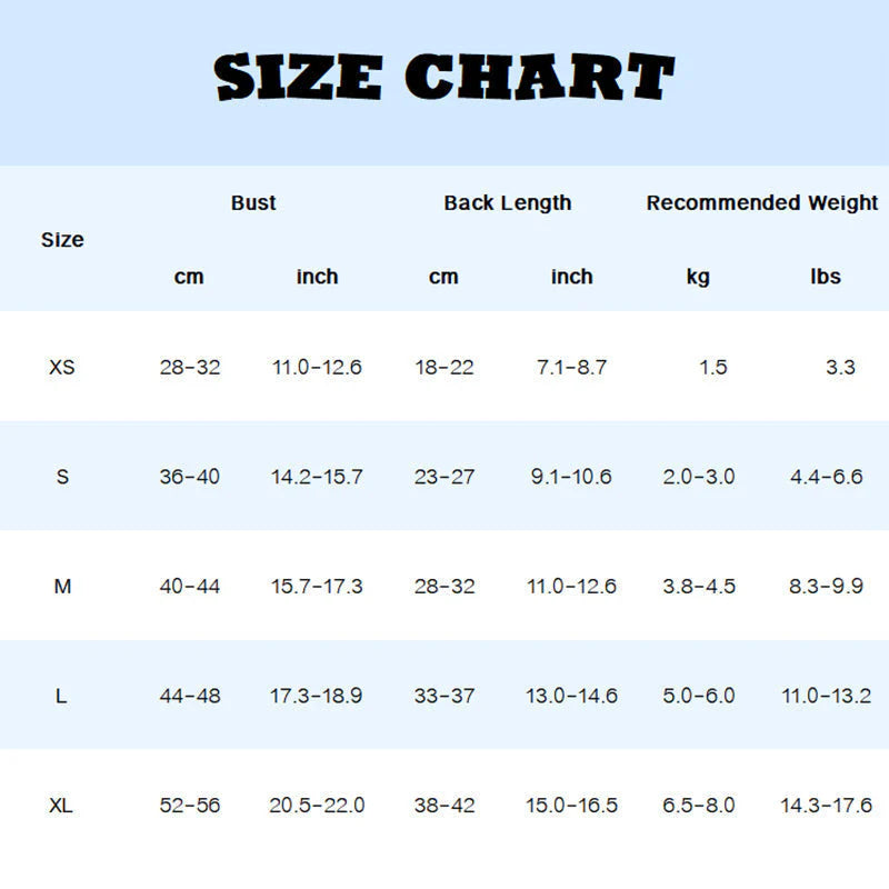 Při výběru velikosti zvažte obvod hrudníku a délku zad, zejména u plemen jako jsou knírači, francouzští buldoci a kočky.