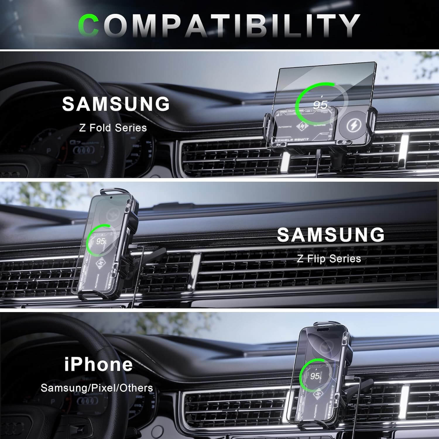 Fitted with infrared sensors, the holder clamps open automatically when its powered on. Just place your phone and the motorized arms will auto-clamp (automatically close and hold) your phone. Made for all size phones. Compatible with Samsung, iPhones, Pixel, OnePlus, Nothing, Moto, Xiaomi, Huawei. Also for Fold & Flip series phones.